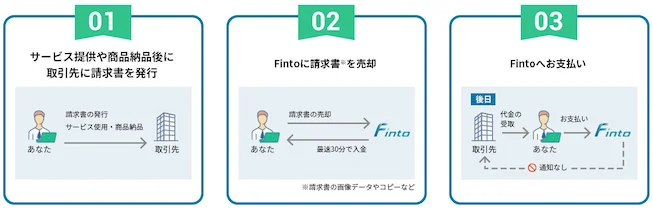 Fintoファクタリングは、入金を待っている請求書(売掛金)を現金化し、スピーディーに運転資金を確保できる「借入に依存しない資金調達手段」です。